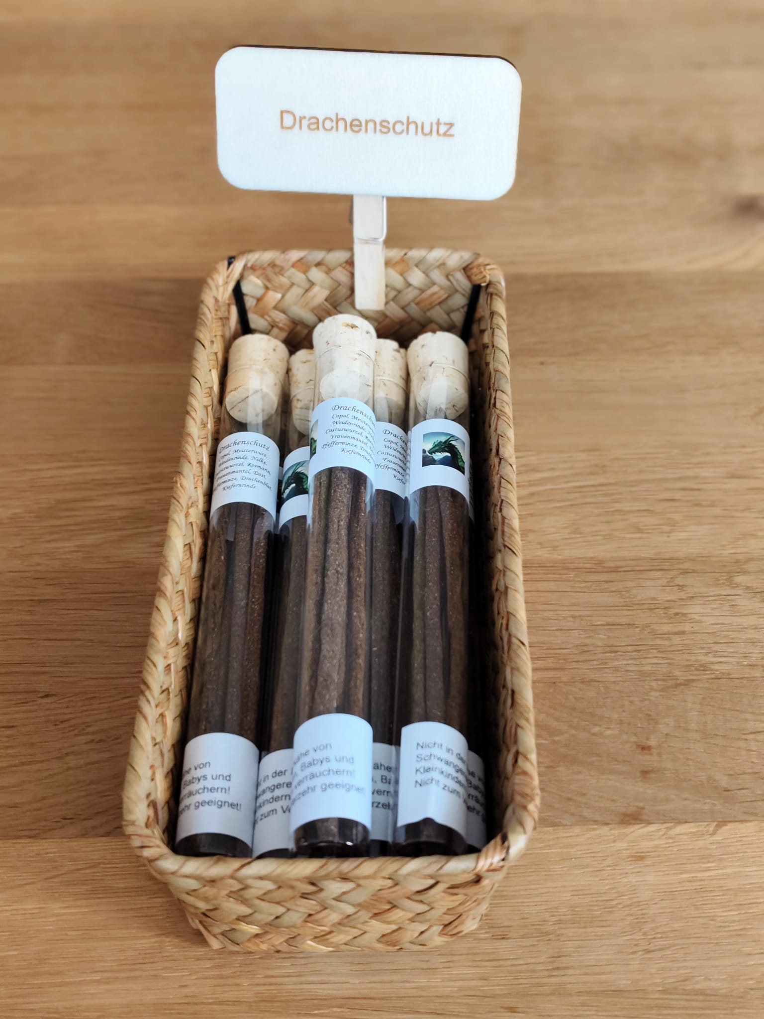 Inhaltsstoffe: Copal, Meisterwurz, Weidenrinde, Nelke, Costuswurzel, Rosmarin, Frauenmantel, Dost, Pfefferminze, Drachenblut, Kiefernrinde, Johannisbrotkernmehl
